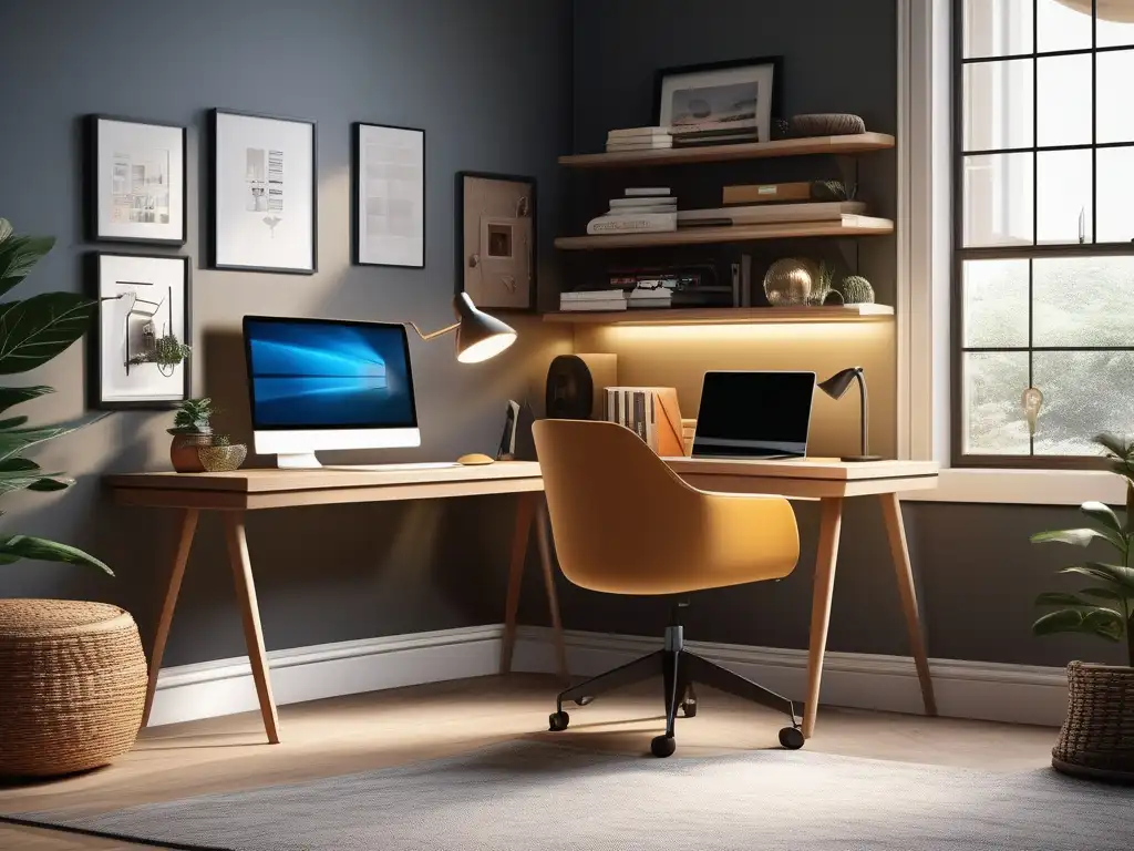 Equipamiento tecnológico homeschooling en un ambiente sereno y minimalista, con una mesa de estudio moderna y una silla ergonómica