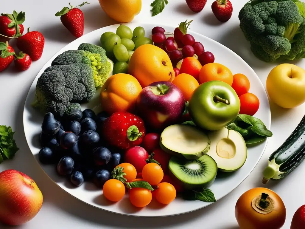 Beneficios de la alimentación consciente en niños: plato de frutas y verduras frescas y coloridas, arregladas de manera artística y atractiva